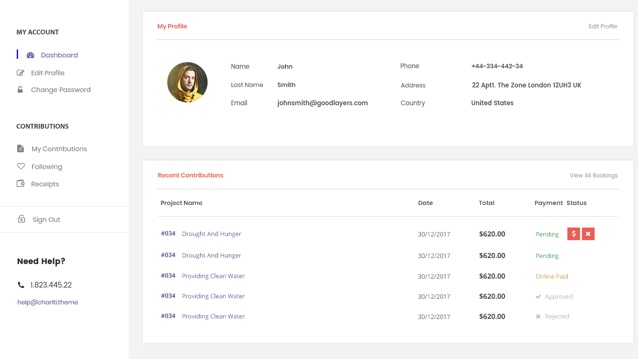 Chariti comes with user registration feature which allow them to login to user’s dashboard to view donation activities, edit profile, view project wish list and view transaction receipt.